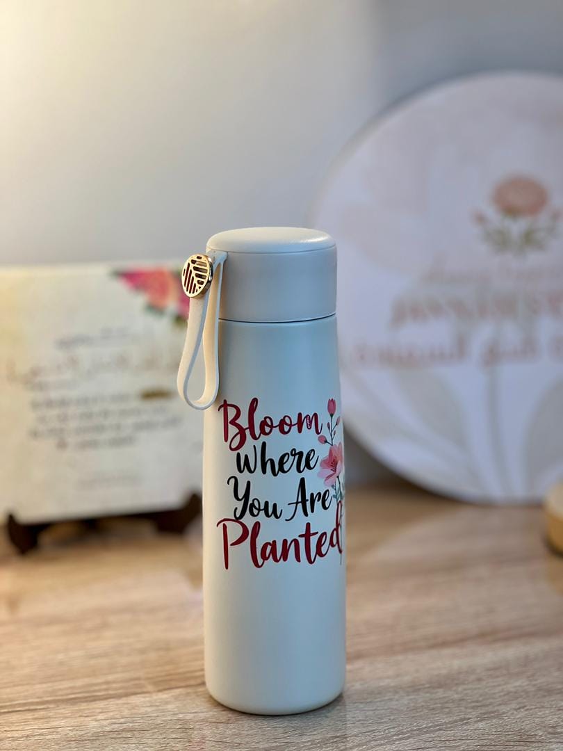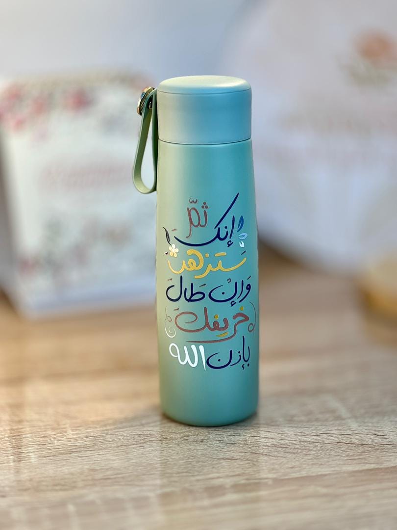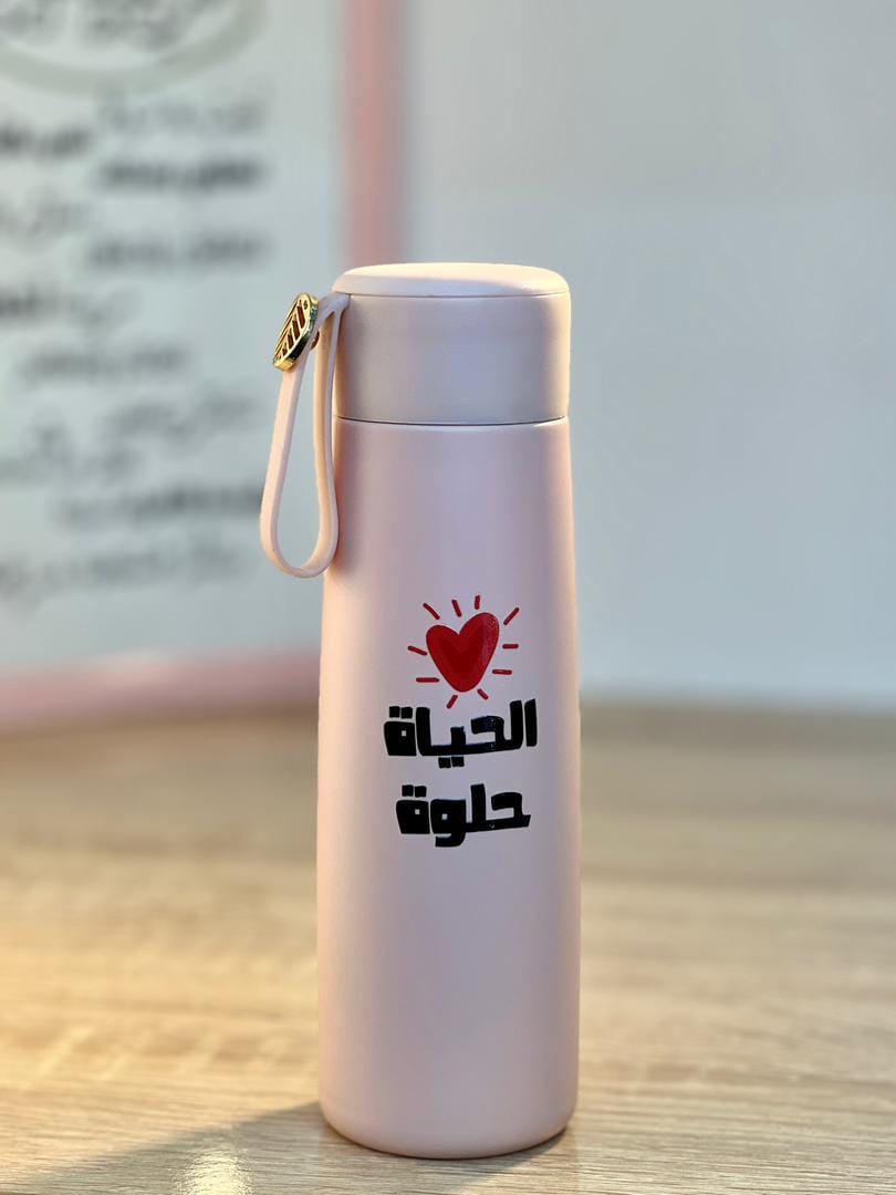 قارورة حرارية بتصميم راقي يجمع بين الألوان الهادئة و التفاصيل اللطيفة، تظيف لمسة رقيقة لمكتبك، و دربك أينما كنتي.